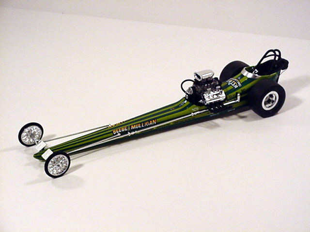 Teaming up with engine builder and tuner, Tim Beebe, driver John Mulligan piloted the famed Beebe & Mulligan "Fighting Irish" green-striped fueler from 1967 until his untimely death weeks after he was injured in a first-round accident at the 1969 U.S. Nationals. One of the most popular and skillful drivers in drag racing, the late John "the Zookeeper" Mulligan was not only fearless, but he possessed an uncanny ability to drop the clutch pedal and leave the starting line like no other. The Beebe & Mulligan team was consistently the quickest and fastest in 1967 and 1968, but had no wins under their belts. Starting the 1969 season with a new Woody Gilmore car, Beebe & Mulligan used the 1969 Winternationals as their stage as they recorded their first and only NHRA National event victory. At the U.S. Nationals qualifying that year, "the Zookeeper" rocketed his Beebe-tuned dragster down the Indianapolis quarter mile with a 6.43 e.t. The run was more than two tenths quicker than the national record and stood for a year. Tragically, Mulligan was badly burned in a first-round accident and died weeks later from his injuries. The Beebe & Mulligan car held the NHRA speed record at 229.59 mph from September 1968 until July 1970. Wrapped in a beautiful Tom Hanna body with George Cerney paint, "the