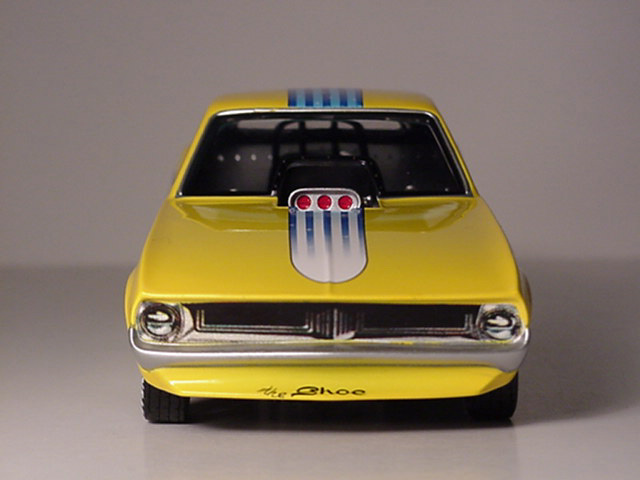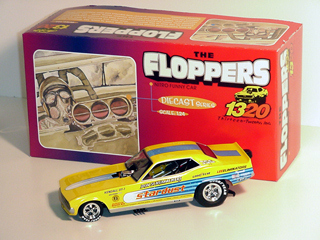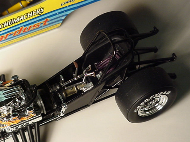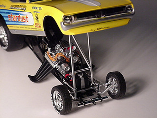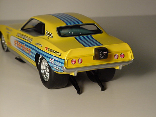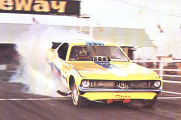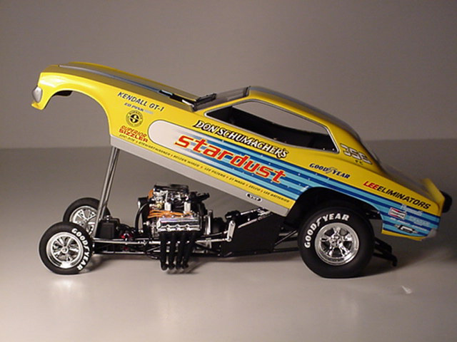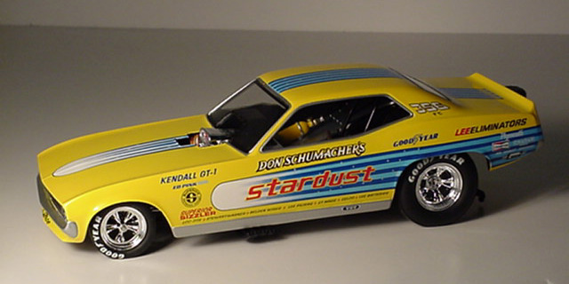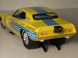 This model is very similar in appearance to Shumacher's previous Plymouth 'Cuda F/C, which he ran at the Pod against Paula Murphy. Rather than suffer the return airfreight costs to get it back home in timely fashion it was sold to Santa Pod Raceway, run as an SPR "house" car with Allan Herridge at the wheel before being sold on to the Stones (in which guise it spent the majority of its active life, and is best remembered in Britain).