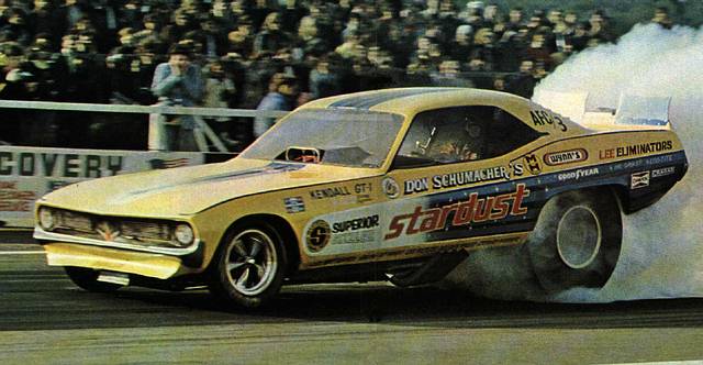 When Don Schumacher hung up his helmet and disbanded his Stardust Funny Car Team in 1974, a huge sigh of relief was heard from rivals like Gene Snow and Raymond Beadle in Texas, Pat Foster and Don Prudhomme in California and the late "Jungle Jim" Liberman in Pennsylvania. "The Shoe" was at the top of his game in 1974 when he retired to devote full time energy to his family business, Schumacher Electric Corporation, in Chicago, Illinois. As a driver, Schumacher is remembered for his unequaled record in match races across the country. As the sport reached its early stages of organization, Don won the 1972 Coca-Cola Cavalcade of Stars Championship, the 1973 AHRA World Championship, five NHRA National Event titles and nine IHRA event titles. His Plymouth Barracuda Funny Cars were dubbed "Stardust" and they were usually listed in the record books with runs like 6.18 seconds at 241.95 MPH in 1974. He was an early ambassador to England where he set long-standing records with the same 1970 'Cuda that he drove to a U.S. Nationals victory. As a car owner, Don's record was even more impressive. His engine, clutch, and aerodynamic advancements made his Funny Cars the leading performers in the country, and his safety innovations, like roof-mounted escape hatches, reduced the threat of fire-related injuries at a time when many Funny Car drivers suffered serious burns. In late 1974, with a family at home and a business in need of his supervision, Don announced his retirement from drag racing. To no one's surprise, Don approached his business with the same work ethic and professionalism, which made him a racing champion. Today, Schumacher Electric Corp. is the world's foremost manufacturer of battery chargers with numerous additional product lines like Schumacher Electric Welders in widespread distribution. Don's interest in drag racing returned when son Tony began racing NHRA sportsman cars in the early 1990s. As Tony progressed from driving sportsman cars to Top Fuel Dragsters, Don's passion kicked into high gear. After winning a Top Fuel NHRA Championship in 1999 in his first year back as an owner, Schumacher continues to be heavily involved in the sport today.