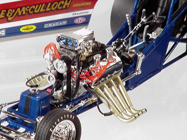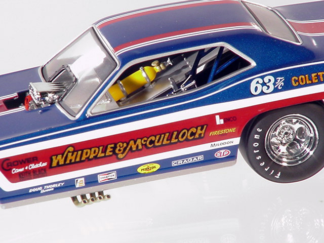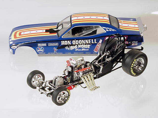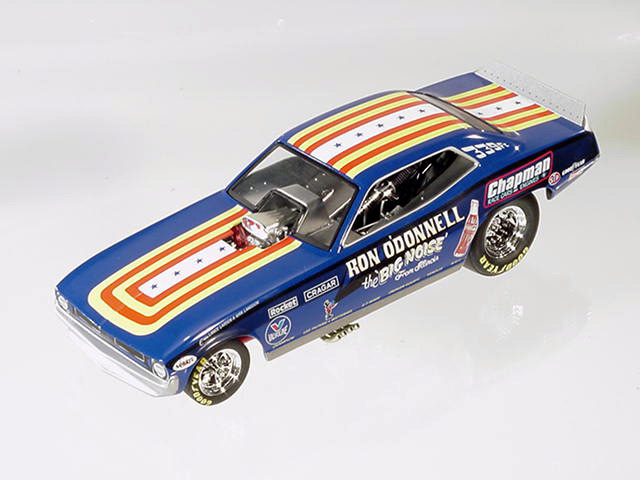 Ron O'Donnell's Big Noise 'Cuda OK, so everyone knows that the name of the state is pronounced without the "s" at the end, but the "Big Noise From Illinoi" just doesn't have the same ring to it, does it? Actually, in the environmentally conscious 1970's, the "Big Noise" from anywhere didn't sound correct (politically correct wasn't even a term then) so Ron O'Donnell changed the name of the car to the "Damn Yankee." There, that shouldn't offend anyone, should it? But then, when you grow up on the south side of Chicago, offending anyone never seems to be a real problem. Ron O'Donnell was one of many very successful match racers from the "Windy City." In a town that would produce such notables as "Mr. Norm," Gary Dyer, Kenny Safford, the "Chi-Town Hustler," Don Schumacher, Ron Pellegrini, Dale Creasy Sr., Gary Bolger, Cliff Brown and many more, Ron was one of the best, most talented and most versatile of the bunch, and match racing was a way of life for him. In the early '70's most Funny Car drag racers made their living by traveling the country in search of the perfect match race, a best two-out-of-three or three-out-of-five encounter that would pack the fans into the local tracks. Ron, who actually took his first ride in one of the legendary "Mr. Norm" cars, would become a fixture at places like Byron Dragway, Cordova and other non-national event tracks. And, while he did have moderate success on the IHRA circuit in the early '70's, where he went to a pair of final rounds, most of his fame and notoriety came on the local level. Ron may have driven more cars down more bad tracks than just about any other driver in the history of the sport, and it was on those tracks where his ability to work on and adjust the clutch really paid off. His beautiful red, white and blue car began life as a Barracuda, later became a Chevrolet Vega and, believe it or not, ended its career as a Mustang, a badly burned Mustang, but through it all, Ron O'Donnell made some really big noise in the drag racing world. Only 2000 pieces of the "Big Noise" funny car were made. Now in stock, price £66-99