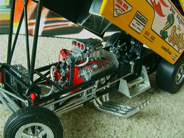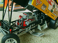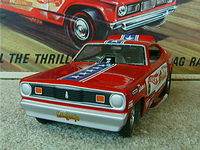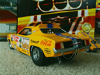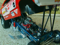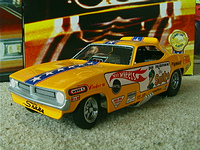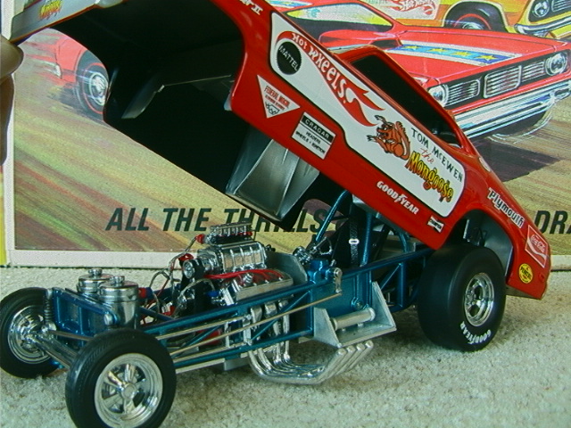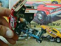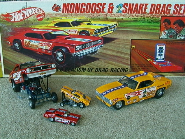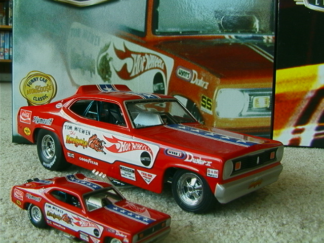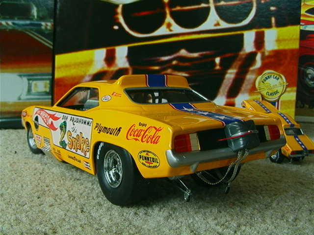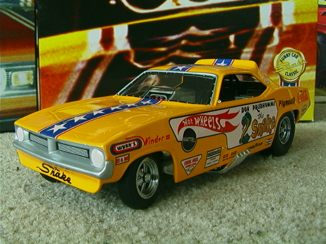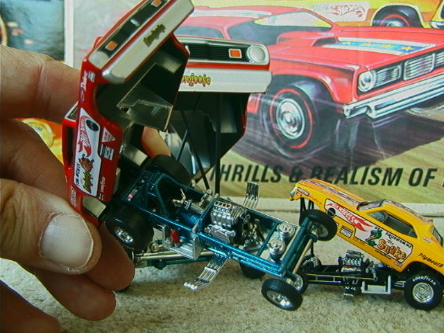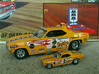 ship over to the floppers. Back to the models, I must admit that I have a soft spot for any cars that have been sponsored by toy companies (Cox and Chaparral would be a case in point) because it guarantees that a decent model will be forthcoming. The early Hotwheels models, and indeed the Monogram kits, were good but not entirely accurate in that they used a chassis that differed only in the injector intake. The Legends models again, as per the prototypes, share a large number of common components but there are noticeable differences between the two such as the fuel tanks. As first generation flip-top funnies it was thought at the time that both front and rear suspension was required and indeed this has been incorporated in the models. Other touches that stand out are the braided fuel lines with blue/red "Aeroquip" colour fittings and wiring and control linkages. Overall these models have been manufactured to an exceptionally high level and it is also true for the accompanying 1/64 scale pieces (which simply should not be compared to the old red-line racers which are fun to own but not very well detailed - as a piece of trivia I recollect a short drag racing documentary film in which McEwen is surrounded by boys, he asks them whether they have the Hotwheels toys and then goes on to ask which one was faster, they all say the Snake which was also true for mine). If there is a fault with the models it is that they have chosen to use the later versions with the all too obvious roof spoliers, spoilers is certainly the right term as both the Duster and Barracuda bodies looked better without them and I have absolutely no idea why Mattel did not opt for the cleaner original versions. . £ 53-99 each, inclusive of postage to UK addresses, bear in mind that these were issued at $120 stateside and you might agree that they are now something of a bargain for the larger diecasts, and of course you get the smaller models as well. (No I don't want to sell the old race set) Home |